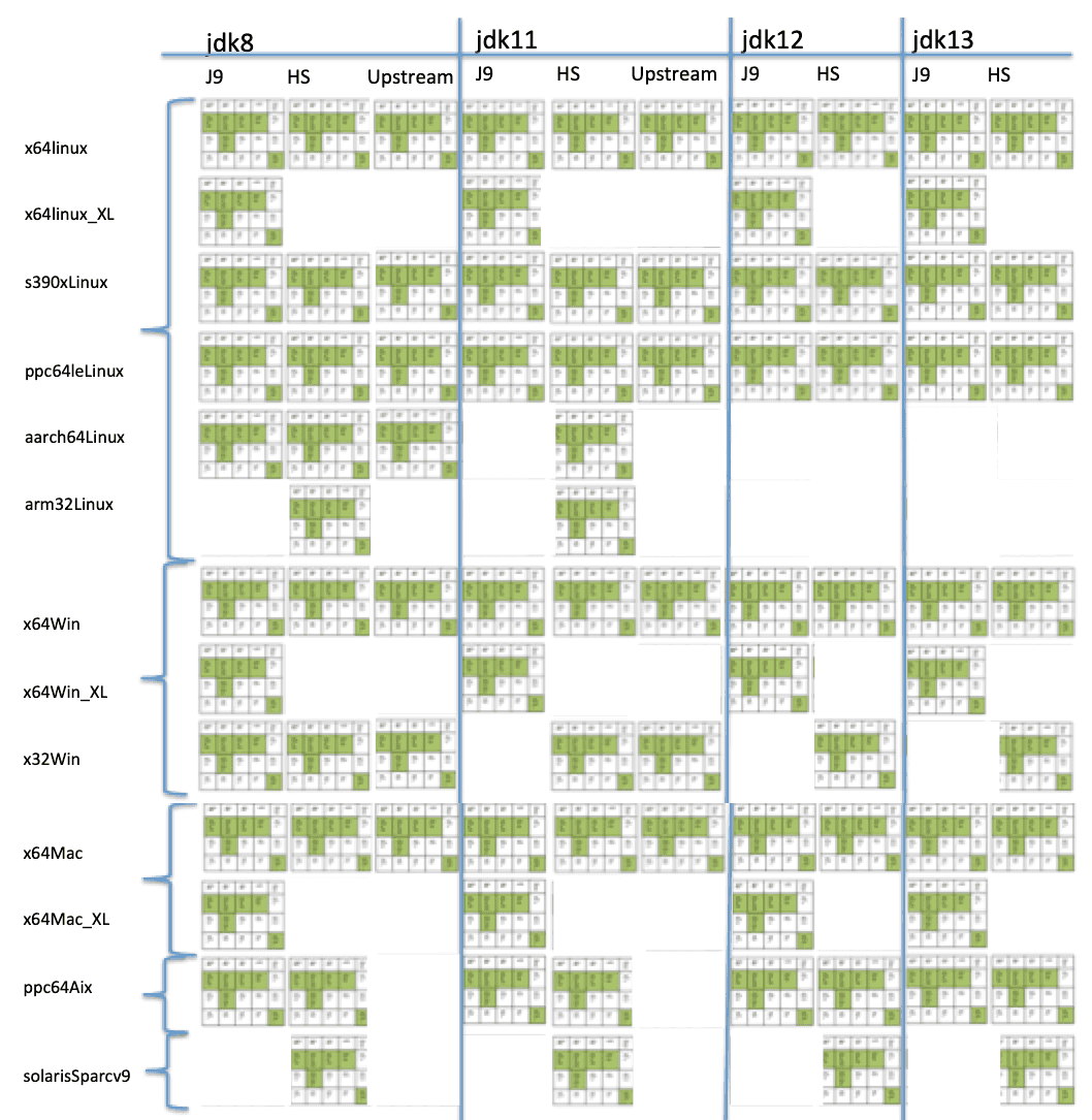Multiplying the versions, platforms and implementations expands the grid into a much larger test matrix. The implementations refer to different builds (J9=OpenJ9, HS=Hotspot and Upstream respectively) which are available from adoptopenjdk.net.