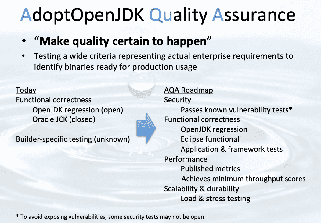 Why AQA? We believe that open languages deserve open testing. When we looked at what testing was openly available to developers and to OpenJDK implementers, and running on visible servers, the ‘well’ was somewhat ‘dry’. There’s the OpenJDK regression suite, a wonderful set of tests, but does not cover all of the verification requirements needed to “make quality certain to happen”. Those regression tests begin to address the functional correctness requirement but we also needed to verify the security, scalability, performance, durability requirements. Our roadmap arose from the lack of a large and diverse pool of tests being used to verify the quality of OpenJDK binaries, and the desire to run testing in the open.